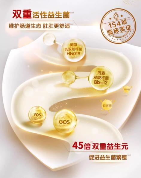 同时,它含有了四倍双重益生菌(HN019+Bb-12)和益生元(GOS+FOS),就像给肠道“派去帮手”,既能直接补充有益菌,又能为菌群提供营养,让小分子蛋白和小脂肪球的吸收更高效。